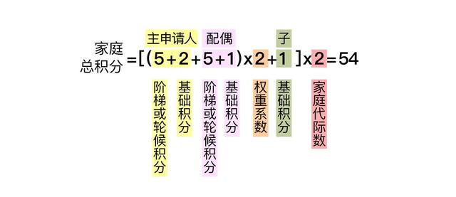 2、家庭申請人中不包含主申請人配偶的,家庭總積分公式:家庭總積分=(主申請人積分+其他成員積分之和)×家庭代際數(shù)