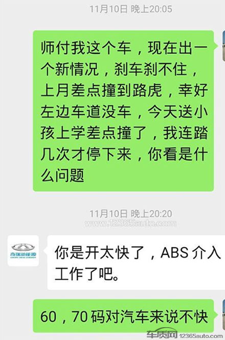 來自廣東的車主祝先生也向車質(zhì)網(wǎng)反映,在遇突發(fā)情況緊急制動時出現(xiàn)剎車失靈問題。向4S店工作人員反饋后,得到的回復(fù)卻說可能是祝先生車開的太快,ABS介入工作導(dǎo)致的。此后到4S店做檢查,工作人員也只是隨便試了試車,在沒有仔細檢查車輛的情況下,就稱車輛制動系統(tǒng)沒問題。