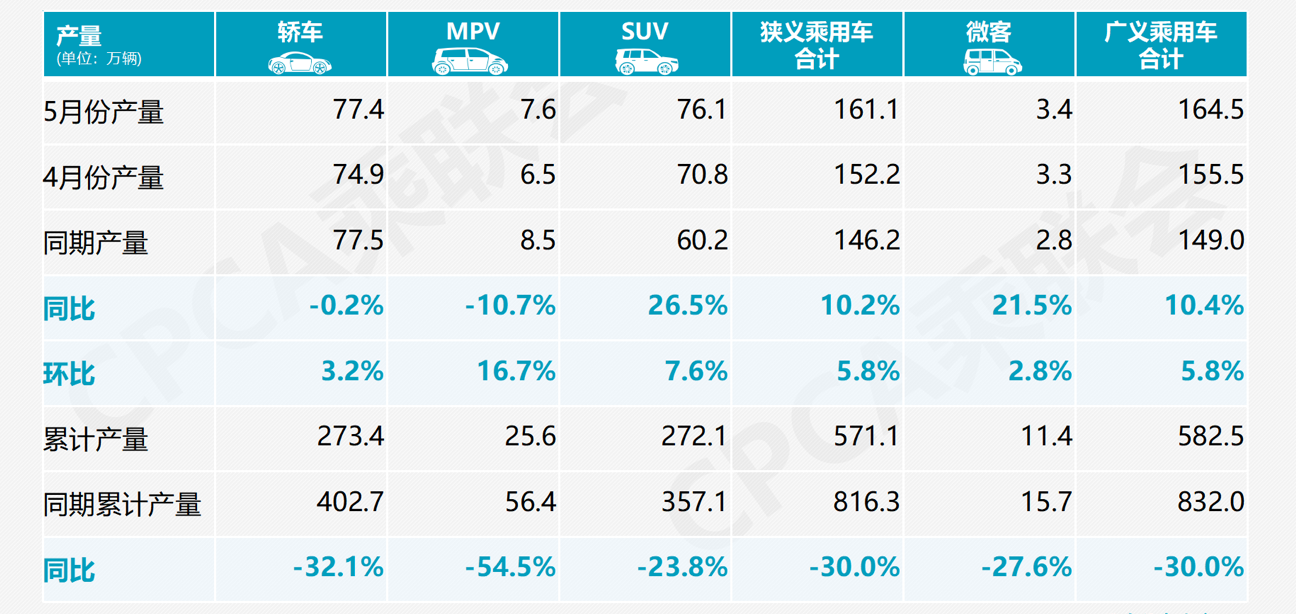 4月乘用車生產(chǎn)164.5萬輛,同比增長10.4%;1-5月累計(jì)生產(chǎn)582.5萬輛,同比下降30%。其中,豪華車生產(chǎn)同比增長29%,合資品牌的生產(chǎn)量同比增長8%,而自主品牌的同比增長量為6%。