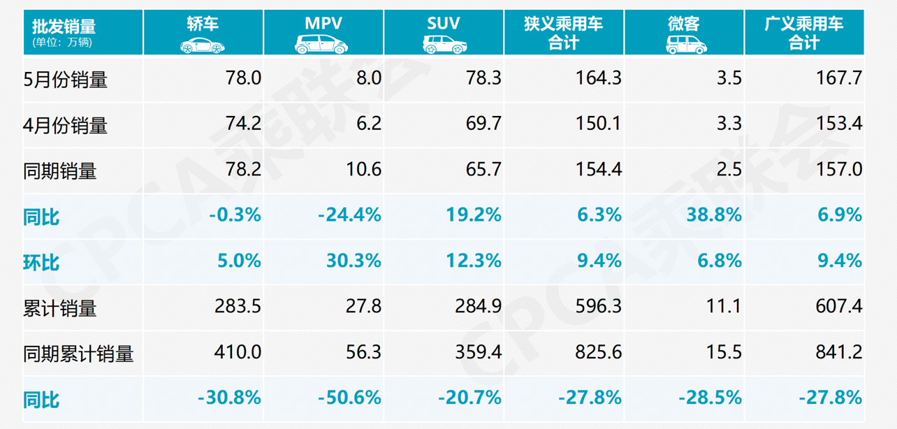 5月廠家批發(fā)銷量167.7萬輛,同比增長6.9%,環(huán)比增長9.4%。1-5月累計(jì)批發(fā)銷量607.4萬輛,同比下降27.8%。