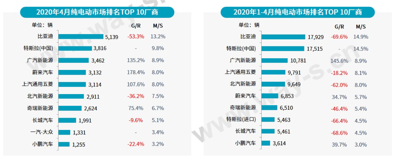 從純電動汽車廠商銷量來看,2020年4月,純電動市場前10廠商市場份額約為73.8%;比亞迪超越特斯拉(中國)重回榜首,廣汽新能源晉升第三。累計(jì)來看,比亞迪穩(wěn)居首位,特斯拉(中國)緊隨其后,廣汽新能源位列前三。