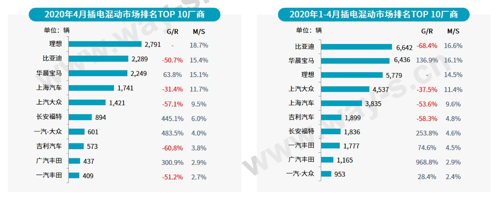 從插電混動市場車型銷量排名來看,2020年4月,插混市場銷量前10廠商市場份額約89.8%。理想繼續(xù)發(fā)力,重回首位,比亞迪和華晨寶馬位列第二、第三;累計(jì)來看,比亞迪和華晨寶馬穩(wěn)居第二,理想上升第三。