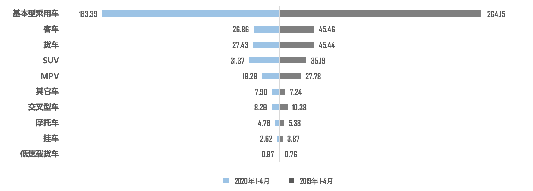 從車型角度來看,2020年1-4月基本型乘用車共交易183.39萬輛,同比下降30.57%;客車26.86萬輛,同比下降40.92%;載貨車27.43萬輛,同比下降39.63%;SUV 31.37萬輛,同比下降10.85%;MPV18.28萬輛,同比下降34.19%;交叉型乘用車8.29萬輛,同比下降20.10%。