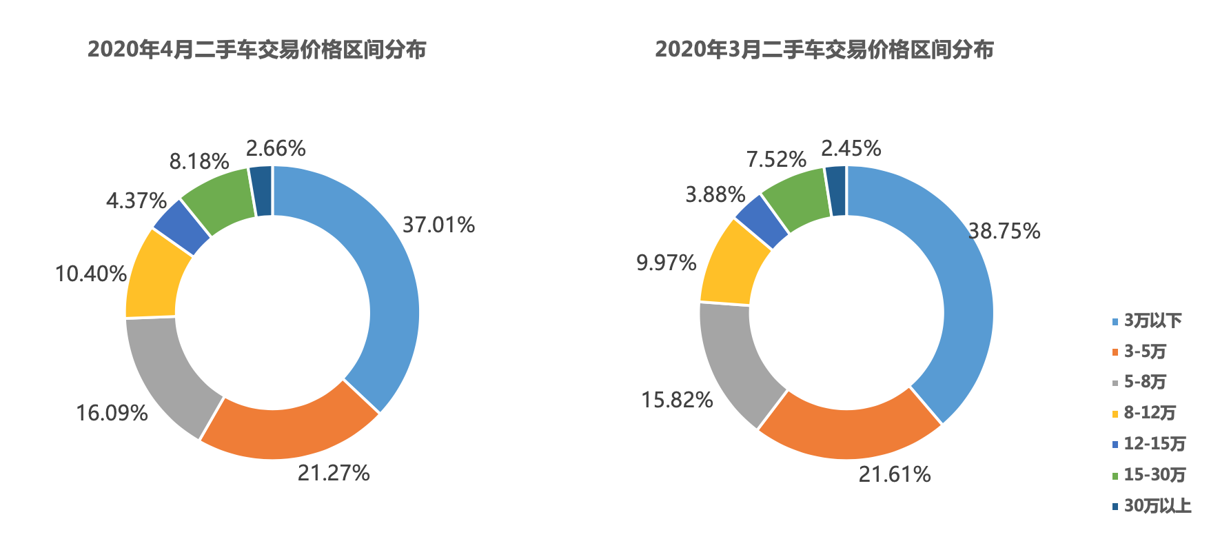 從價(jià)格區(qū)間來看,4月,二手車交易價(jià)格區(qū)間在3萬元以下的車輛市場占比最大,為37.01%,環(huán)比下降1.73%;30萬元以上價(jià)格區(qū)間的二手車交易市場占比最小,為2.66%,環(huán)比增長0.21%;4月份,除3萬以下、3-5萬價(jià)格區(qū)間的二手車交易量環(huán)比有所下降以外,其他價(jià)格區(qū)間交易量環(huán)比均有所增長。