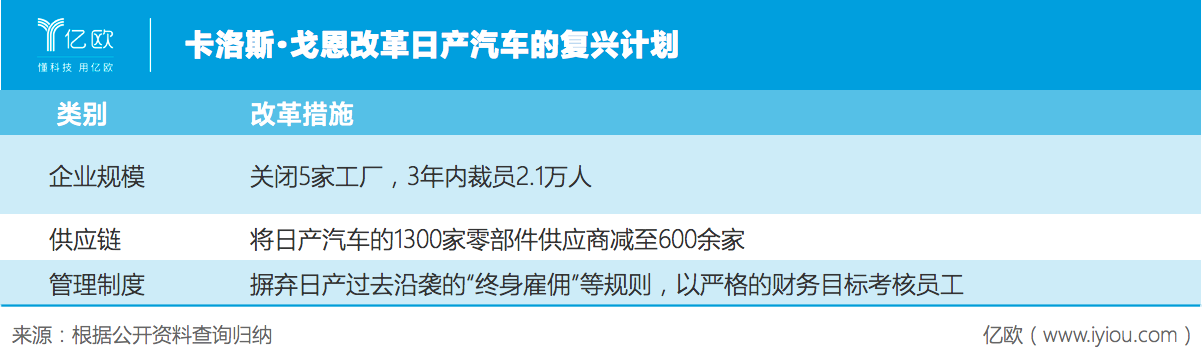 “戈恩的游戲”也始于這一年。一貫以鐵血手腕著稱的戈恩剛上臺,就進(jìn)行了大刀闊斧的改革。不僅讓負(fù)債2.1萬億日元的日產(chǎn)起死回生,并在兩年后實現(xiàn)扭虧為盈,還使得日產(chǎn)復(fù)興計劃提前實現(xiàn)。