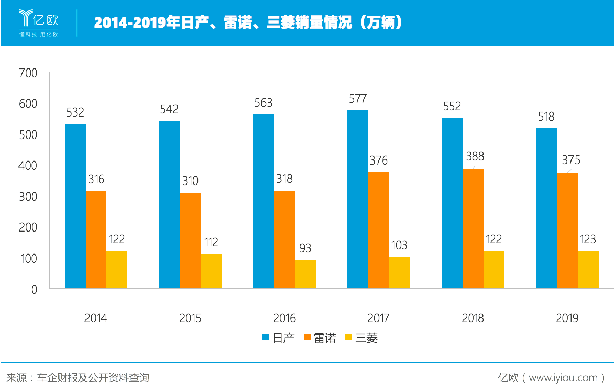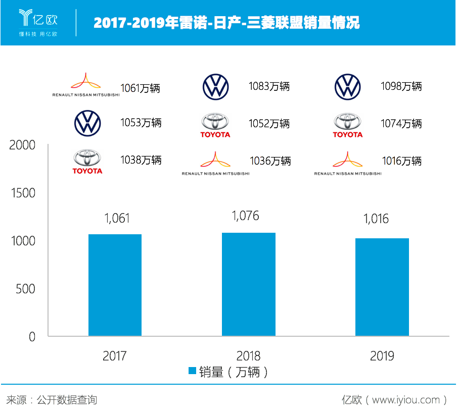 不出所料,聯(lián)盟下行趨勢已經(jīng)成為既定事實。數(shù)據(jù)顯示,2019年日產(chǎn)汽車、法國汽車巨頭雷諾與三菱汽車的企業(yè)聯(lián)盟總計售出1015.5萬輛,較上年下滑5.6%,由全球第二跌至第三。