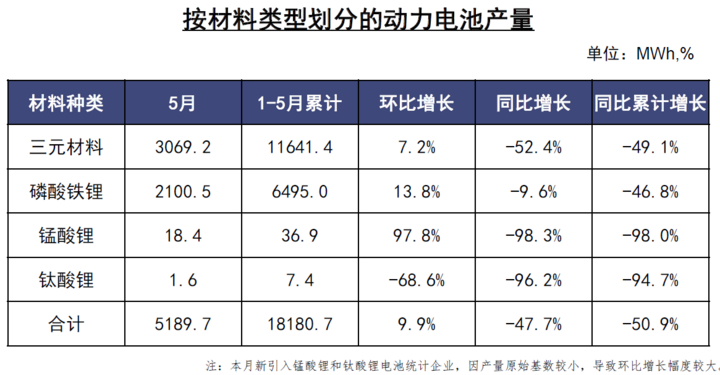 1-5月,我國動力電池產(chǎn)量累計18.2GWh,同比累計下降50.9%。其中三元電池產(chǎn)量累計11.6GWh,占總產(chǎn)量64.0%,同比累計下降49.1%;磷酸鐵鋰電池產(chǎn)量累計6.5GWh,占總產(chǎn)量35.7%,同比累計下降46.8%。