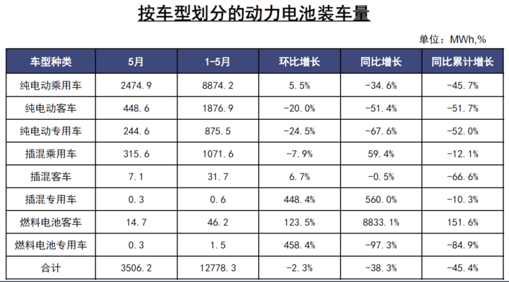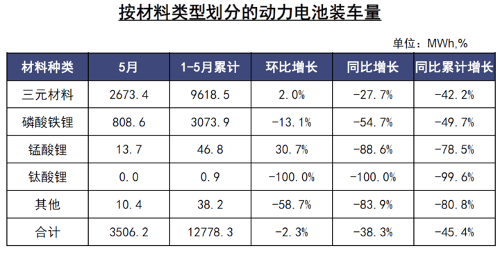 前5月,我國動力電池裝車量累計12.8GWh,同比累計下降45.4%。其中三元電池裝車量累計9.6GWh,占總裝車量75.3%,同比累計下降42.2%;磷酸鐵鋰電池裝車量累計3.1GWh,占總裝車量24.1%,同比累計下降49.7%。