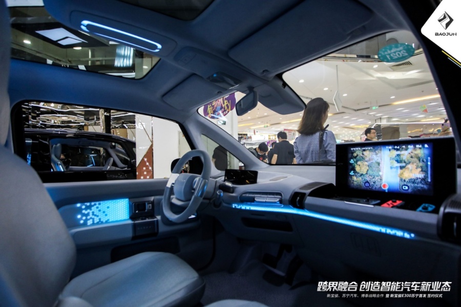 此次的南京蘇寧易購首家新寶駿智慧空間,給現(xiàn)場媒體帶來了更多驚喜。這家位于核心城區(qū)大型Mall內(nèi)的智慧空間,以沉浸式的智能體驗,建立起與用戶的連接。入口的IOT體驗區(qū),陳列著眾多IOT設(shè)備,諸如掃地機器人、智能音箱等,都能通過E300在駕駛途中從車內(nèi)直接操控,實現(xiàn)家車互聯(lián)互動。車輛互動體驗區(qū)中采用“星際幾何”設(shè)計的E300令人眼前一亮,小巧可愛的外形適合靈活穿梭于城市的擁擠空間;甚至用語音就可以控制ADAS系統(tǒng);智慧儀表與智能車聯(lián)融為一屏,開車時視覺感受更簡潔。