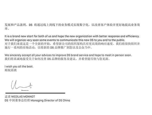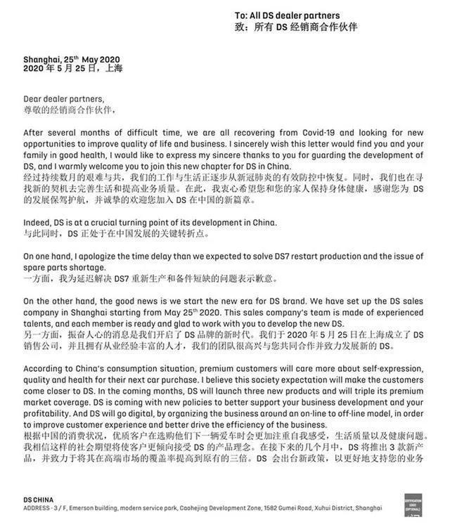 雖然長安PSA不復(fù)存在,但DS品牌多次表態(tài)不會退出中國。今年5月25日,DS中國董事總經(jīng)理向國內(nèi)經(jīng)銷商發(fā)送公函,表示DS品牌已經(jīng)全面投入復(fù)工復(fù)產(chǎn),并在上海成立了全新的DS銷售公司,這意味著DS將繼續(xù)保持獨立銷售體系,不會歸屬于神龍汽車。