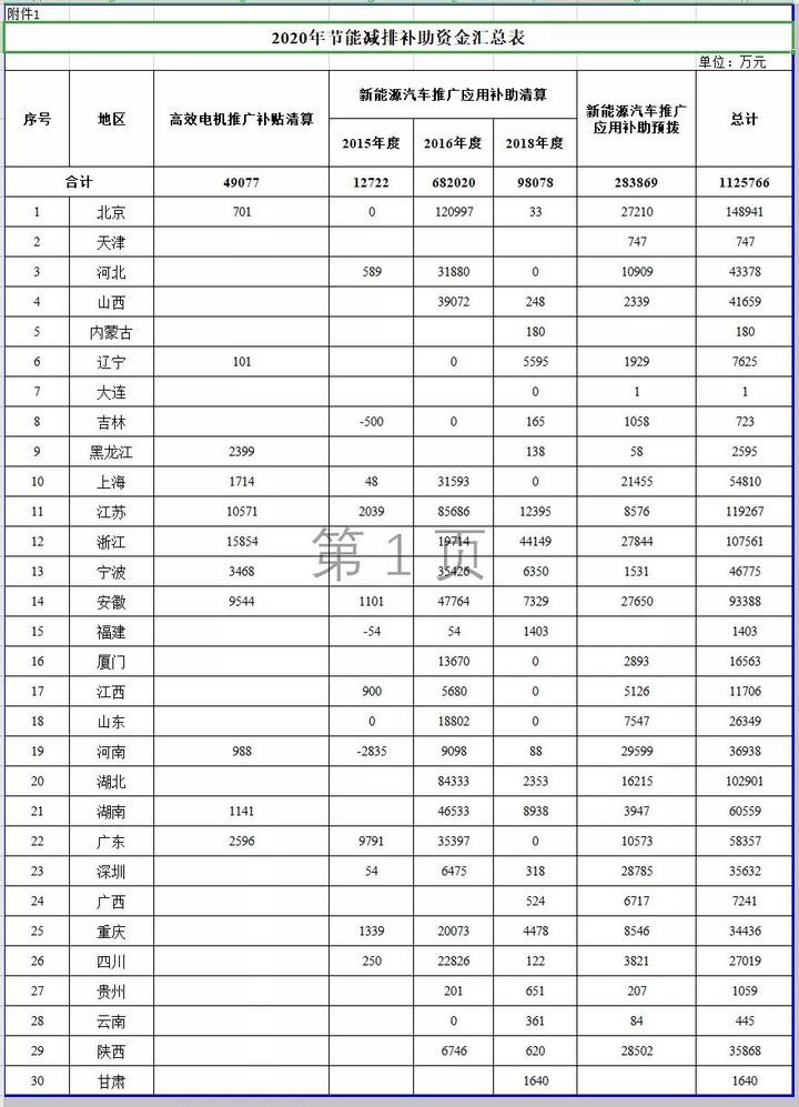 近日,財(cái)政部發(fā)布了《關(guān)于下達(dá)2020年節(jié)能減排補(bǔ)助資金預(yù)算的通知》,其中包含2015-2018年度各省市的新能源汽車推廣應(yīng)用購(gòu)置補(bǔ)貼清算和新能源汽車推廣應(yīng)用補(bǔ)助預(yù)撥情況。
