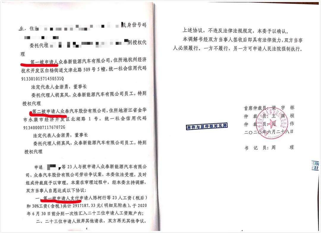 6月中旬,討薪員工迎來調(diào)解結(jié)果,眾泰和部分員工對(duì)付款金額、付款周期達(dá)成共識(shí),并簽署了仲裁調(diào)解書,6月30號(hào)支付全部被拖欠的工資,如果不發(fā)薪或面臨強(qiáng)制執(zhí)行。
