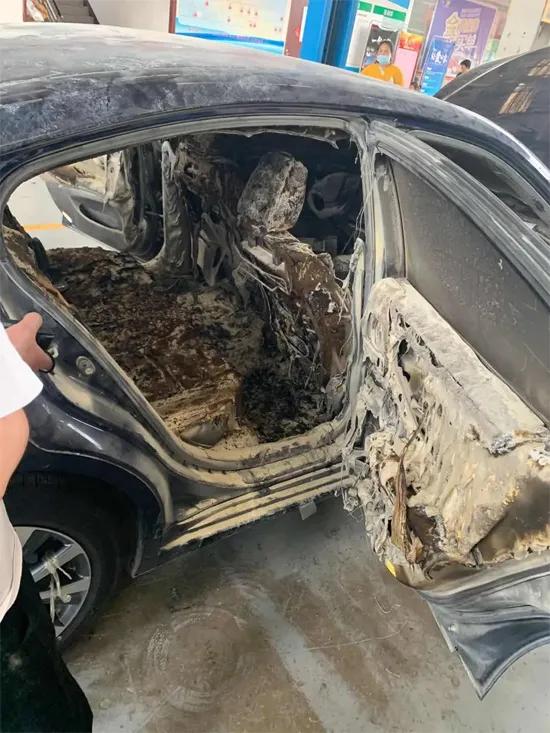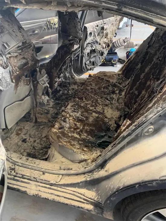 據(jù)提供的照片可見(jiàn),車輛自燃情況被撲滅后,從外殼來(lái)看并沒(méi)有受到太大損傷,但車輛內(nèi)部已被完全燒毀,從前車的中控到車輛的后排座椅均被燒的破爛不堪。