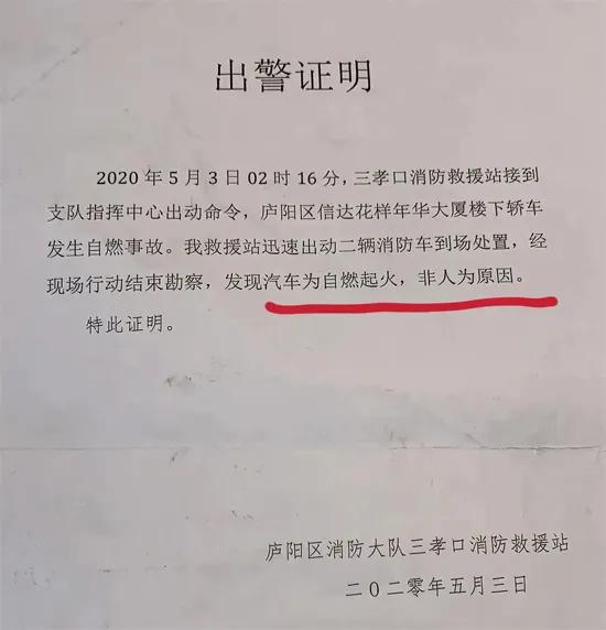 于是周先生也進(jìn)行報(bào)警處理,在消防隊(duì)趕來(lái)處理后,消防部門(mén)出具了一份證明:發(fā)現(xiàn)車輛為自燃,非人為縱火。
