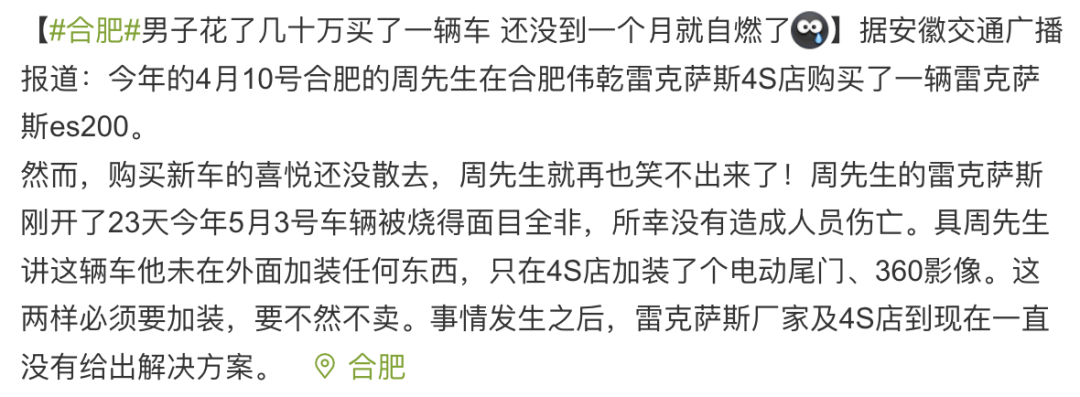 據(jù)了解,這是合肥的周先生于今年4月10號(hào)在合肥偉乾雷克薩斯4S店購(gòu)買(mǎi)了一輛雷克薩斯es200。沒(méi)想到僅僅用車23天,于5月2日凌晨02點(diǎn)10分車輛就發(fā)生自燃情況,幾分鐘內(nèi)車輛就被燒的面目全非。