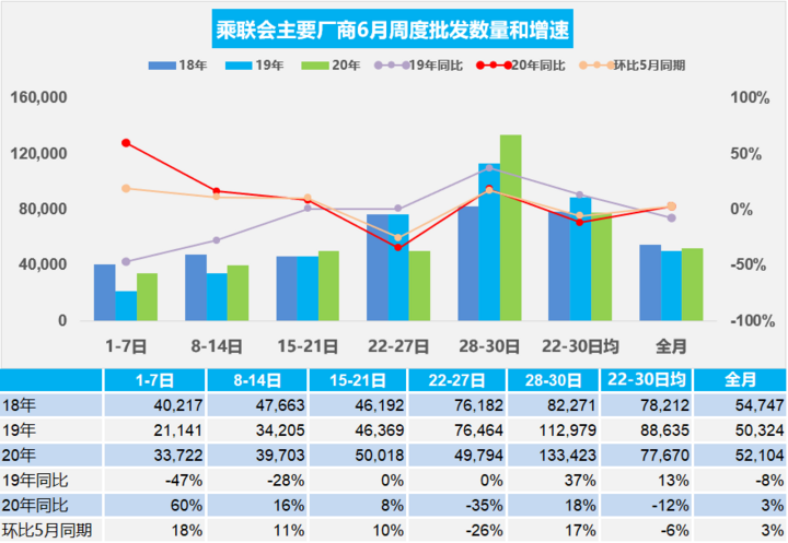 第五周時(shí)間短,不單獨(dú)分析。組合看:6月四至五周(22-30日)的零售達(dá)到日均7.8萬輛,同比下降12%,而且環(huán)比5月同期的日均批發(fā)也是偏低的,體現(xiàn)相對(duì)平穩(wěn)走勢(shì)。