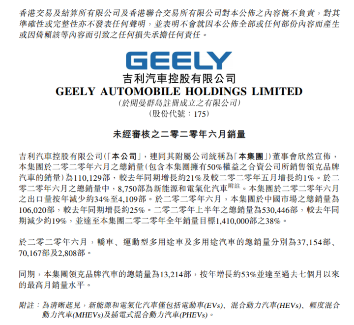 吉利汽車(00175.HK)7月6日晚間公告,公司六月總銷量為11.01萬部,較去年同期增長約21%,環(huán)比增長約1%。上半年公司總銷量為53.04萬部,較去年同期減少約19%,并達至公司全年銷量目標的38%。2020年6月總銷量中,8,750部為新能源和電氣化汽車。