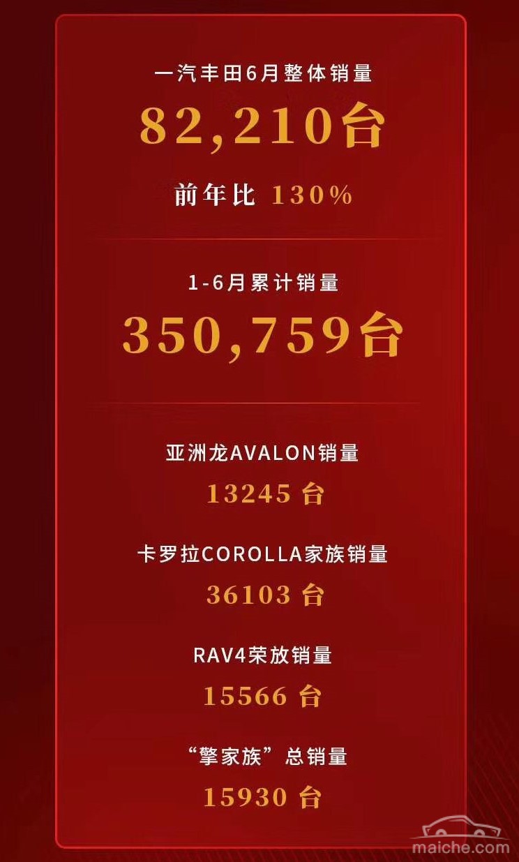 2020年7月伊始,一汽豐田就率先發(fā)布了最新的銷量數(shù)據報告。數(shù)據顯示,2020年6月,一汽豐田單月銷量達82210輛,實現(xiàn)同比增長30%,1-6月累計銷量達350759輛,同比微增0.7%。