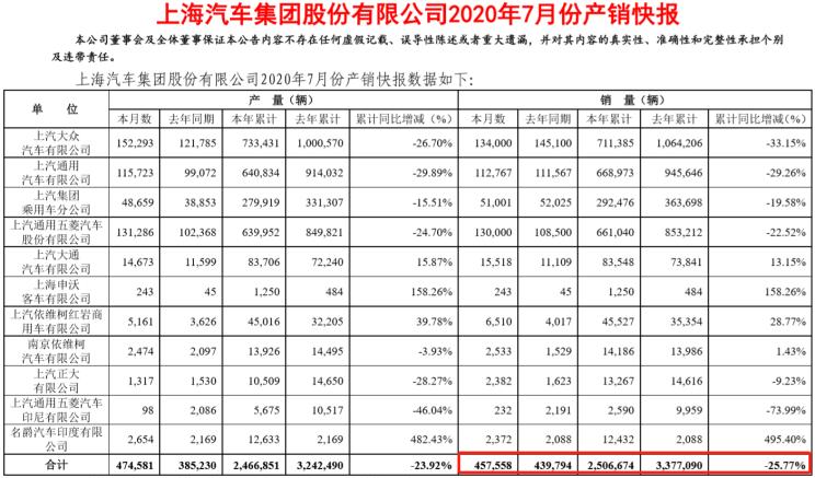 8月7日,上汽集團(tuán)公布最新銷量業(yè)績,數(shù)據(jù)顯示,上汽集團(tuán)7月銷量為45.76萬輛,同比增長4%,環(huán)比6月下滑5%;全年累計(jì)銷量為250.67萬輛,同比下滑25.8%。