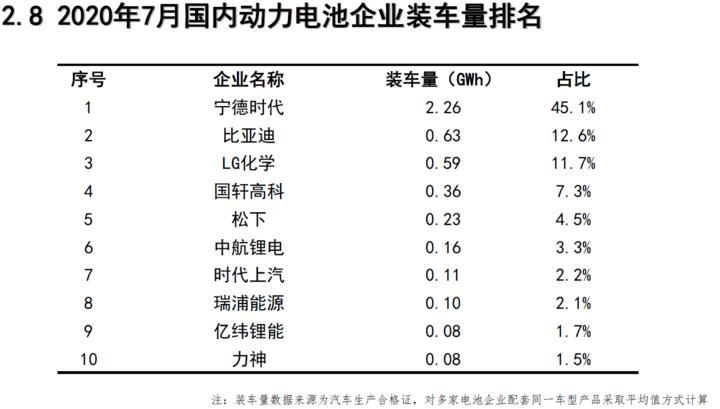 企業(yè)方面,2020年7月,我國新能源汽車市場共計(jì)45家動力電池企業(yè)實(shí)現(xiàn)裝車配套,較6月份減少3家。排名前3家、前5家、前10家動力電池企業(yè)動力電池裝車量分別為3.5GWh、4.1GWh和4.6GWh,占總裝車量比分別為69.4%、81.3%和91 .9%。