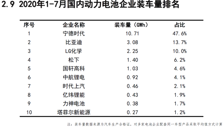 1-7月,我國新能源汽車市場共計(jì)61家動力電池企業(yè)實(shí)現(xiàn)裝車配套,較去年同期減少8家,排名前3家、前5家、前10家動力電池企業(yè)動力電池裝車量分別為16GWh 、18 .5GWh 和20.9GWh ,占總裝車量比分別為 71 .3%、82 .1%和93%。