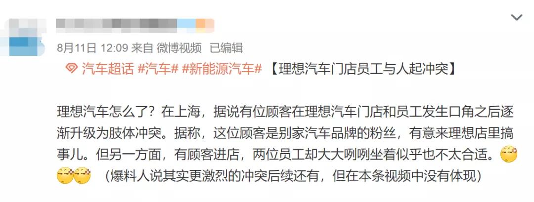 由于監(jiān)控視頻并不完整,暫時(shí)無(wú)法確定是否存在肢體沖突。根據(jù)微博一名發(fā)布視頻的爆料人士消息,據(jù)稱這位顧客是別家汽車品牌的粉絲,有意來(lái)理想店里搞事兒。同時(shí)該人士還說(shuō),“其實(shí)更激烈的沖突后續(xù)還有,但在本條視頻中沒(méi)有體現(xiàn)。”但由于缺乏視頻直接顯示,暫無(wú)法確定是否存在“被打”一事。
