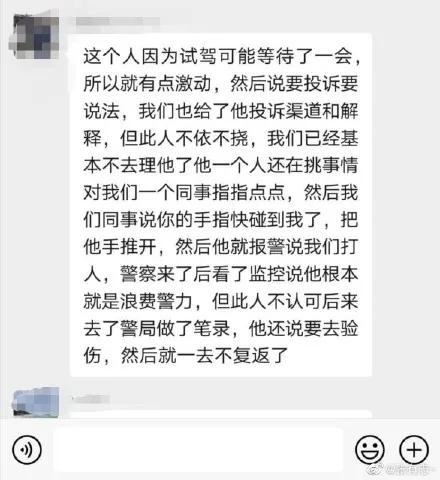 有消息稱,事件起因系顧客對(duì)理想汽車店內(nèi)服務(wù)不滿。根據(jù)一份網(wǎng)傳的微信群聊天截圖顯示,“這個(gè)人因?yàn)樵囻{可能等待了一會(huì),所以就有點(diǎn)激動(dòng),然后說(shuō)要投訴要說(shuō)法,我們也給了他投訴渠道和解釋,但此人不依不饒,我們已經(jīng)基本不去理他了,他一個(gè)人還在挑事情,對(duì)我們一個(gè)同事指指點(diǎn)點(diǎn),然后我們同事說(shuō)你的手指快碰到我了,把他手推開(kāi),然后他就報(bào)警說(shuō)我們打人,警察來(lái)了后看了監(jiān)控說(shuō)他根本就是浪費(fèi)警力,但此人不認(rèn)可,后來(lái)去了警局做了筆錄,他還說(shuō)要去驗(yàn)傷,然后就一去不復(fù)返了”。