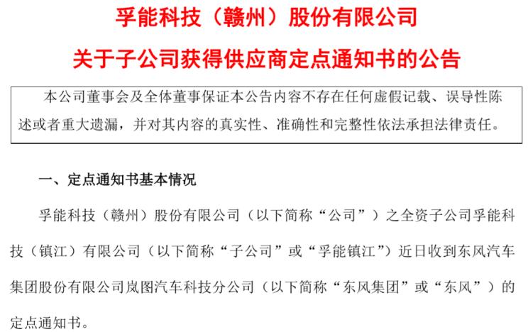 8月25日晚,孚能科技(688567)發(fā)布公告,稱子公司近日收到了東風(fēng)汽車集團(tuán)股份有限公司嵐圖汽車科技分公司的定點(diǎn)通知書,已被指定為東風(fēng)嵐圖H56項(xiàng)目的動(dòng)力電池供應(yīng)商,承擔(dān)其開發(fā)和未來供貨的工作。