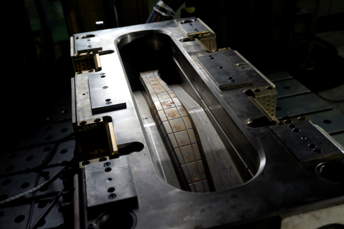 盡管碳纖維的優(yōu)勢廣為人知,但與鋼鐵等其他材料相比,其價格較為昂貴。由于定型困難,也影響了碳纖維復(fù)合材料(CFRP)組件的批量生產(chǎn)。日產(chǎn)汽車基于現(xiàn)有的生產(chǎn)方式,開發(fā)出“壓縮樹脂傳遞模塑法(compression resin transfer molding)”。即在現(xiàn)有生產(chǎn)工藝中,將碳纖維鍛造成適當(dāng)?shù)男螤?,并放置在模具中,同時在碳纖維和模具頂部之間保留微小空隙,然后在空隙間注入樹脂并使其硬化定型。