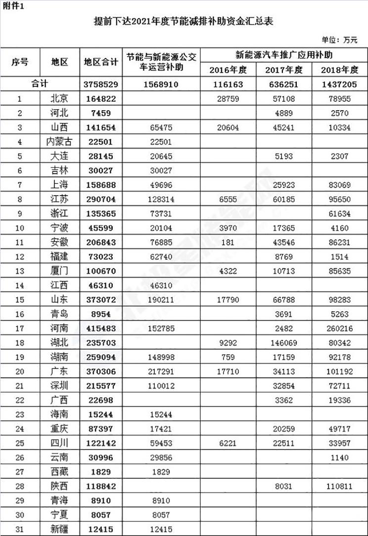 日前,國家財政部提前下達了2021年新能源汽車補貼資金預(yù)算,據(jù)文件顯示,2021年共安排新能源汽車補貼375.8529億元,其中包含新能源公交車運營補助和2016-2018年新能源汽車推廣應(yīng)用補貼。