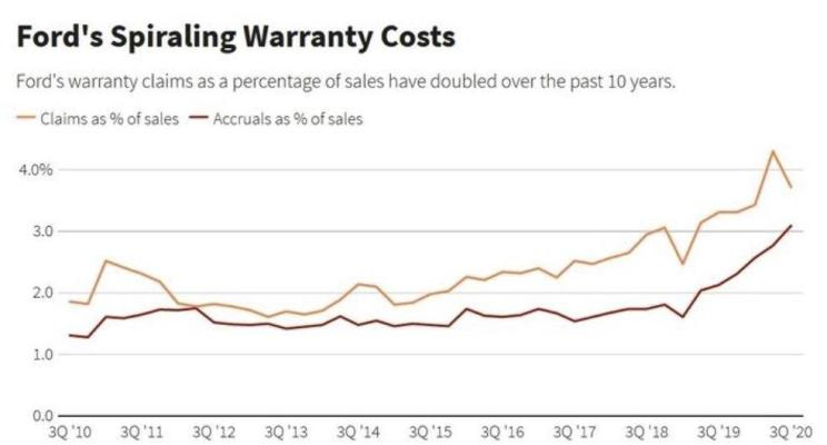 在2012年和2013年,福特主動(dòng)維修車輛的費(fèi)用占每季度銷售額的不到2%;但在2019年年底,由于新冠疫情導(dǎo)致行業(yè)銷售額整體下滑,其主動(dòng)維修費(fèi)用占比超過3%;在2020年第二季度更是達(dá)到了4.3%。福特北美地區(qū)負(fù)責(zé)汽車質(zhì)量的相關(guān)負(fù)責(zé)人表示,“因車輛召回的原因,影響了福特汽車整體的質(zhì)量口碑,這可能也是導(dǎo)致福特汽車不再那么具有競(jìng)爭(zhēng)力的原因之一。”所以福特汽車迫切的提升零部件供應(yīng)商對(duì)質(zhì)量的把控,一來是減少不必要的維修支出,二來也是為了恢復(fù)口碑。