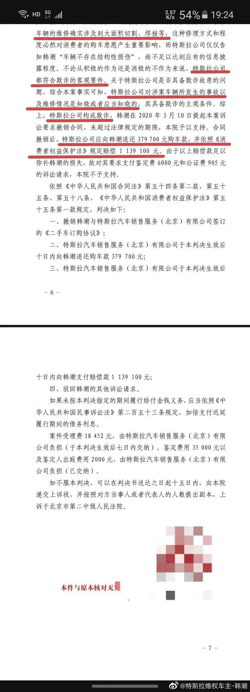 據(jù)其發(fā)布的北京市大興區(qū)人民法院民事判決書顯示,特斯拉公司購成欺詐,判其退一賠三。即購車合同撤銷,特斯拉退還37.97萬元購車款,并賠償113.91萬元。判決書中法院認為,涉案車輛的維修確實涉及到大面積切割、焊接等,這種修理方式和程度必然對消費者的購車意愿產(chǎn)生重要影響,而特斯拉公司僅僅告知韓先生“車輛不存在結(jié)構(gòu)性損傷”,尚不足以達到應(yīng)有的信息披露程度。不論從積極的作為還是消極的不作為來說,特斯拉公司都符合欺詐的客觀要件。關(guān)于特斯拉公司是否具備欺詐故意的問題,綜合本案事實可知,特斯拉公司對涉案車輛所發(fā)生的事故以及維修情況是知曉或者應(yīng)當(dāng)知曉的,其具備欺詐的主觀條件。綜上,特斯拉公司構(gòu)成欺詐。