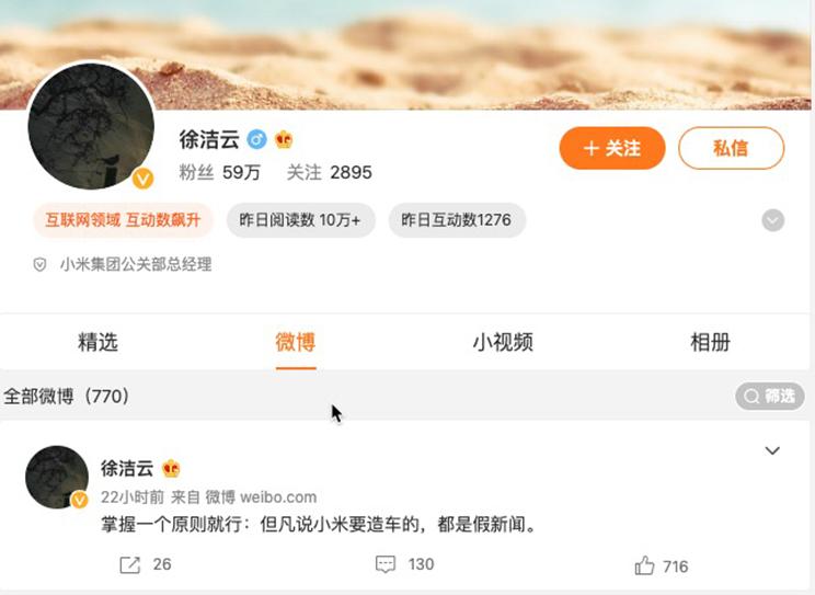 在小米集團公關部副總經理王化個人通過社交平臺進行辟謠后,小米品牌安全官方賬號也針對該條信息進行轉發(fā),并且進一步證實,該信息為假信息。此外,小米集團公關部總經理徐潔云在微博上直接表示“掌握一個原則就行:但凡說小米要造車的,都是假新聞。”關于更多信息,我們也將持續(xù)關注。