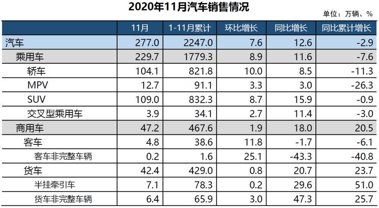 根據(jù)中汽協(xié)公布的2020年11月的數(shù)據(jù),中國汽車市場共實(shí)現(xiàn)產(chǎn)量284.7萬輛,同比增長9.6%;實(shí)現(xiàn)銷量277萬輛,同比增長12.6%。2020年1-11月,中國車市完成累計(jì)產(chǎn)銷量分別為2237.2萬輛和2247萬輛,同比分別下滑3%和2.9%,降幅進(jìn)一步收窄。
