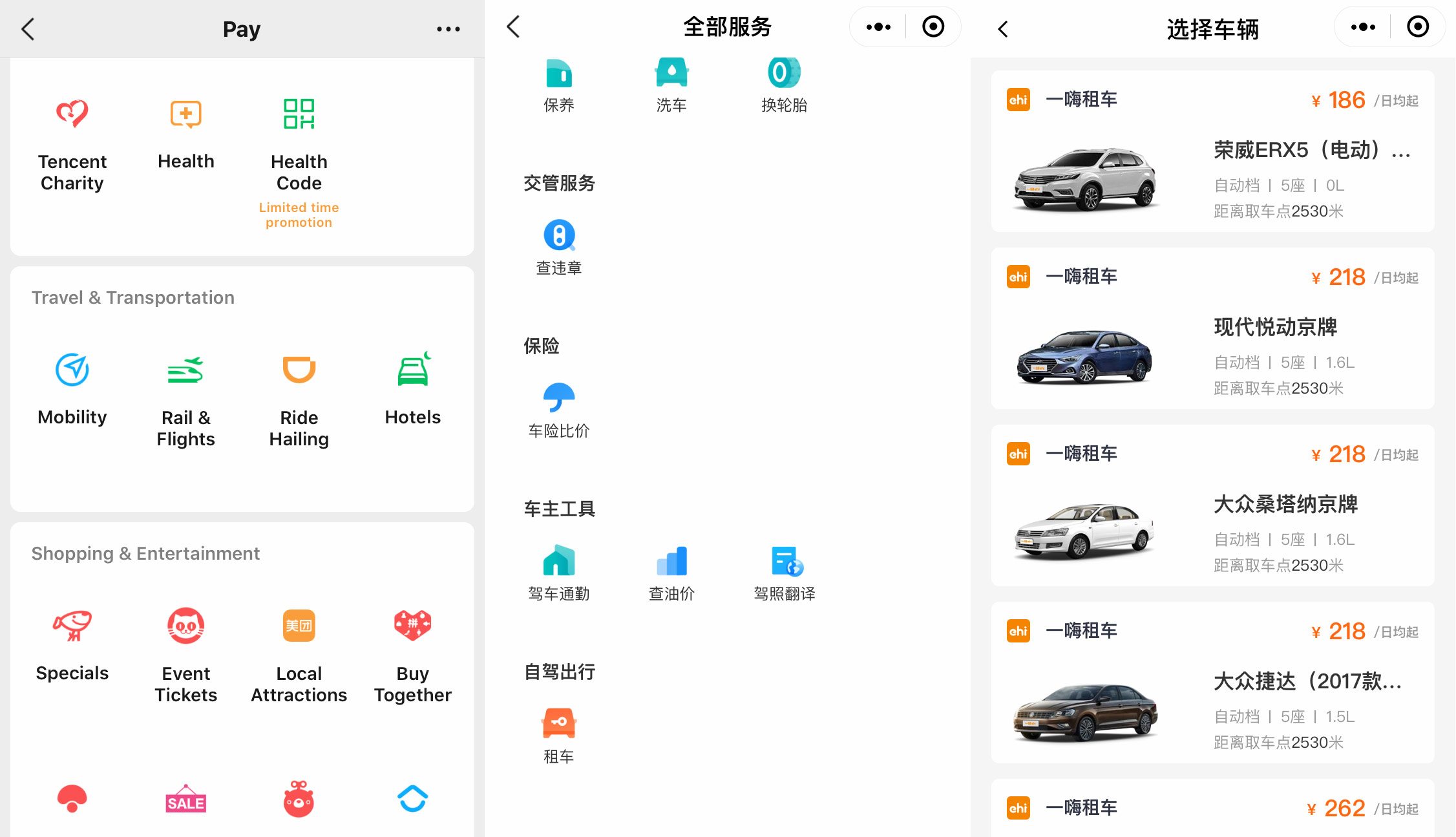 毫無疑問,微信是目前國(guó)內(nèi)移動(dòng)互聯(lián)網(wǎng)用戶使用最多的跨平臺(tái)即時(shí)通訊工具,微信支付作為國(guó)內(nèi)領(lǐng)先的第三方支付平臺(tái),其中又以對(duì)接大眾生活的各類服務(wù)方案受到個(gè)人與企業(yè)用戶的歡迎;一嗨租車則是國(guó)內(nèi)直營(yíng)覆蓋范圍最大的汽車連鎖租賃企業(yè),網(wǎng)點(diǎn)遍及全國(guó)450多座城市,6000多個(gè)線下服務(wù)網(wǎng)點(diǎn),旗下各類車型達(dá)200余種,車輛規(guī)模8萬余臺(tái)。其以多樣化的車型選擇和閃租、免驗(yàn)車、免押金、送車上門等特色服務(wù)深受年輕群體的喜愛。