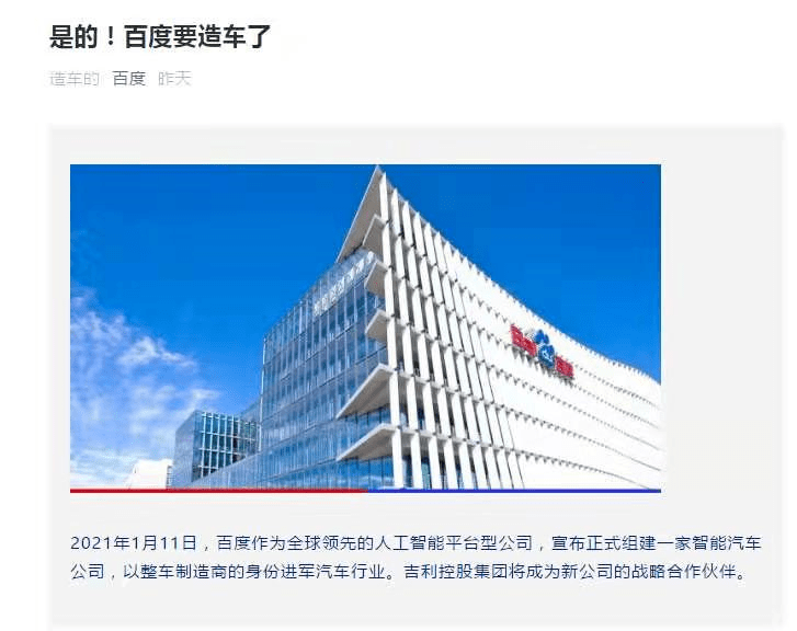 百度最近聯(lián)合吉利組建一家合資公司百度汽車,以整車制造商的身份進(jìn)軍汽車行業(yè)。