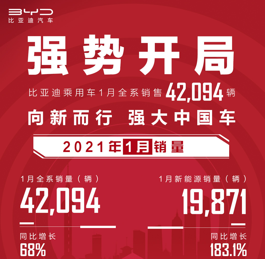 中國(guó)汽車新聞網(wǎng)2月7日訊 2021年2月初,比亞迪汽車宣布1月乘用車銷售達(dá)42094輛,同比大增68%,實(shí)現(xiàn)了2021年的“開門紅”。其中,新能源車銷售19871輛,同比大增183.1%。新能源汽車?yán)塾?jì)銷量超過93萬,連續(xù)8年穩(wěn)居全國(guó)第一。