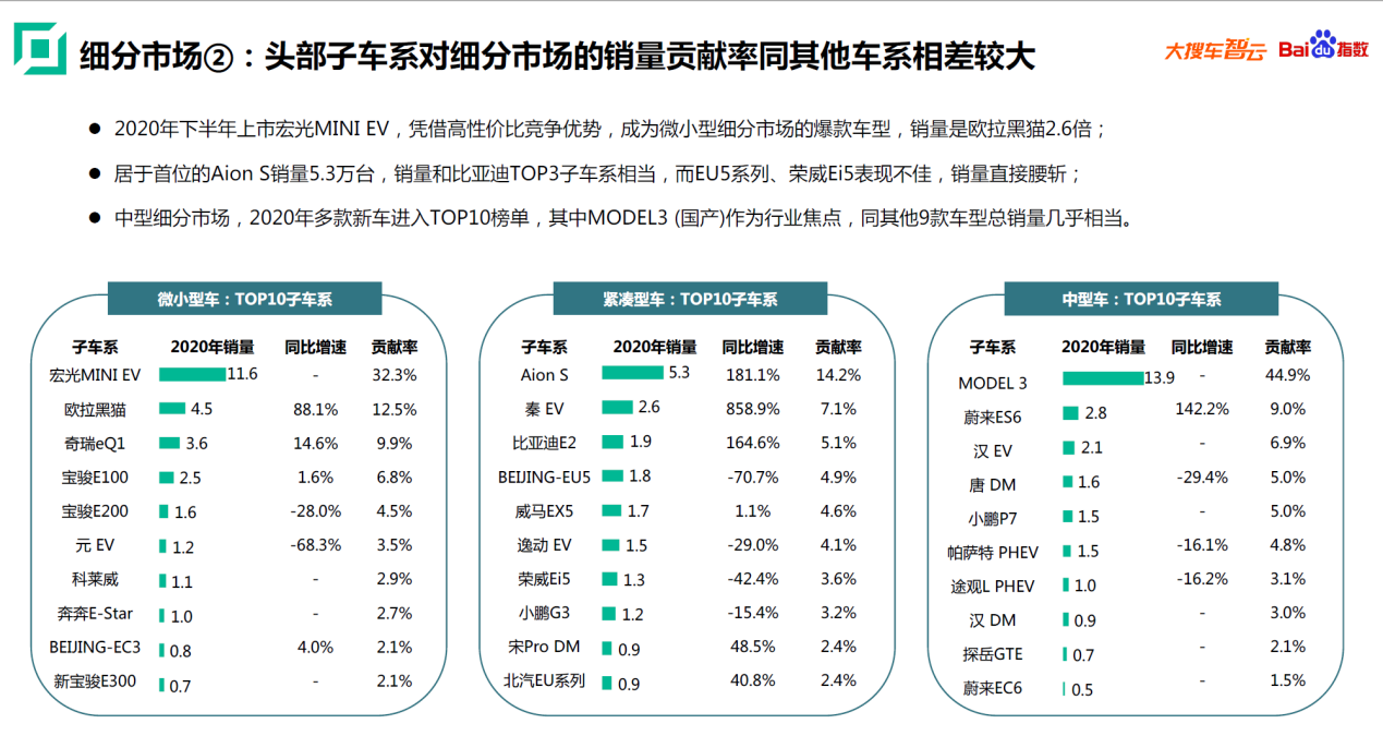 由于宏光MINI和MODEL3(國產(chǎn))的上市,使得微型和中型車型細(xì)分市場份額大幅上漲,2020年新能源車市場“高低端”兩頭分化特征明顯。