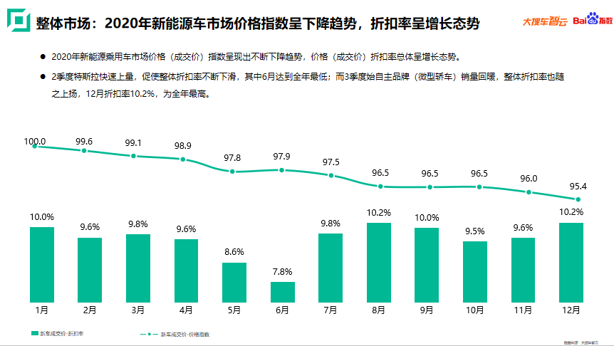 2020年新能源乘用車市場價格指數(shù)呈現(xiàn)出不斷下降趨勢,價格折扣率總體呈增長態(tài)勢。受2季度特斯拉市場份額上升影響,市場整體價格折扣率不斷下滑,而3季度始自主品牌銷量回暖,整體折扣率也隨之上揚(yáng)。同自主(傳統(tǒng)車企)和合資品牌相比,小鵬、威馬等造車新勢力價格折扣率波動幅度較大。