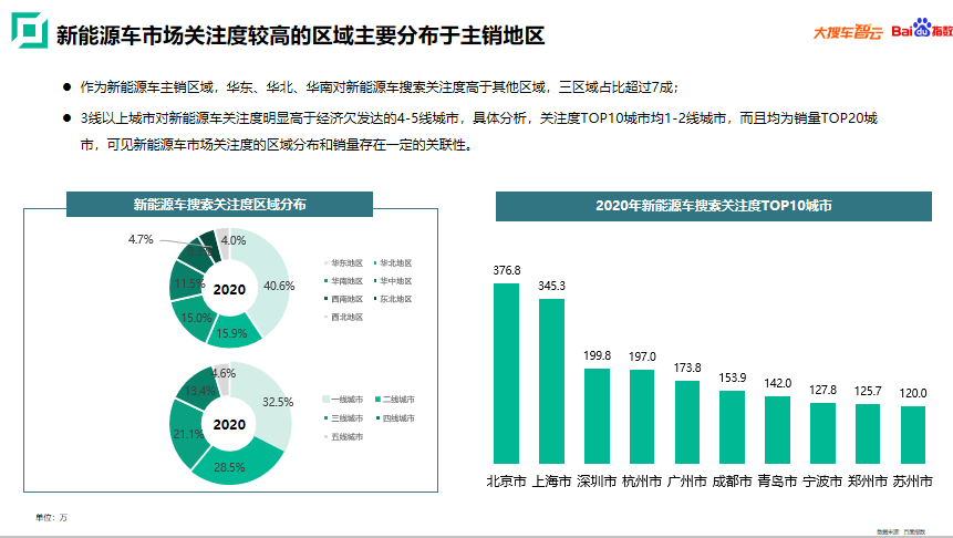 新能源車市場關(guān)注度較高的區(qū)域主要分布于主銷地區(qū),北京、上海、深圳等關(guān)注度TOP10城市均為1-2線城市,而且均為銷量TOP20城市,可見新能源車市場關(guān)注度的區(qū)域分布和銷量存在一定的關(guān)聯(lián)性。