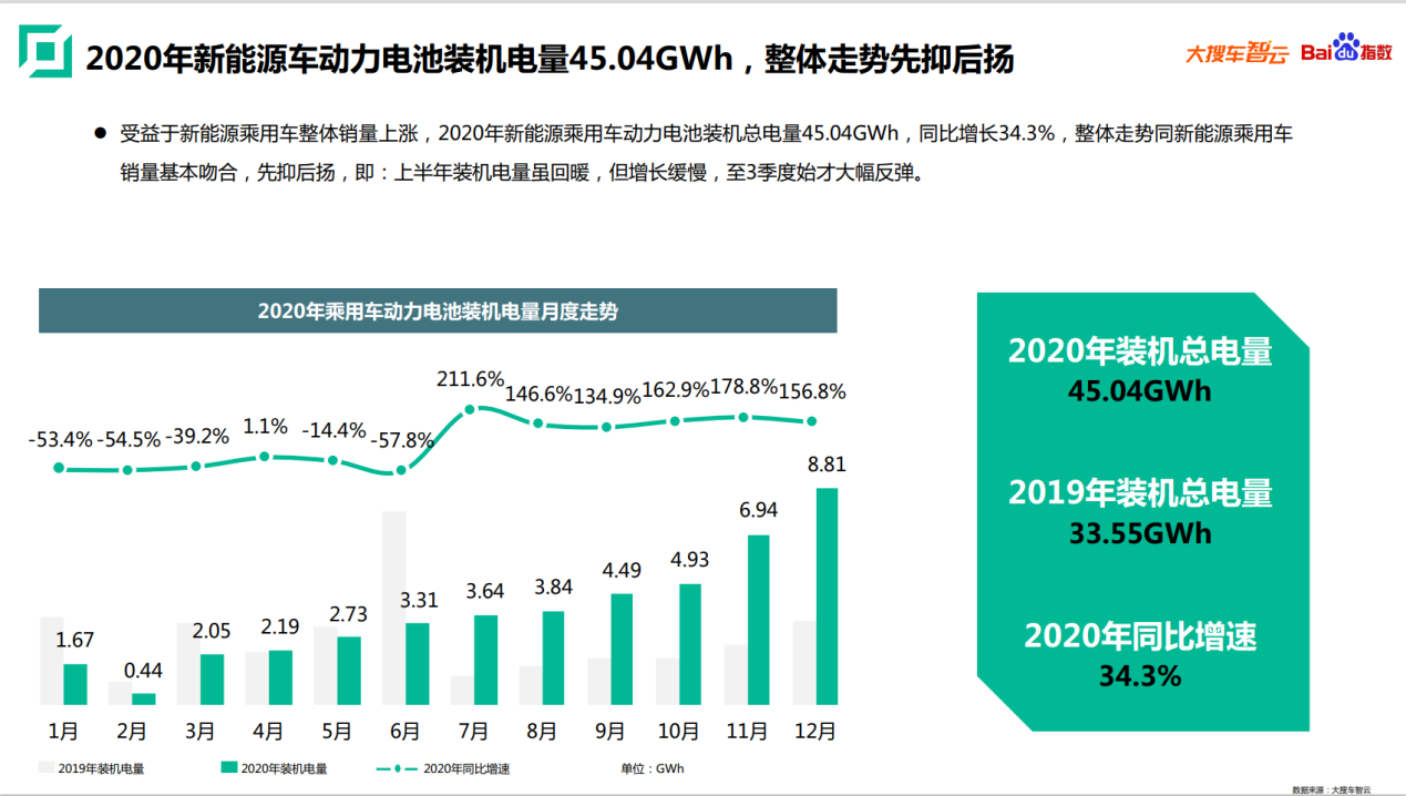 受益于新能源乘用車整體銷量上漲,2020年新能源乘用車動力電池裝機(jī)總電量45.04GWh,同比增長34.3%,整體走勢同新能源乘用車銷量基本吻合,先抑后揚(yáng)。2020年微型和中型轎車銷量增長,帶動LFP電池份額大幅上升;