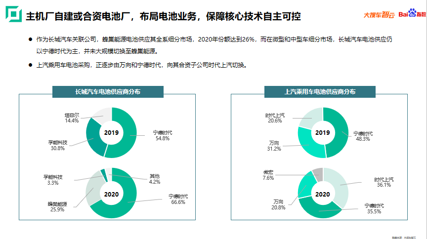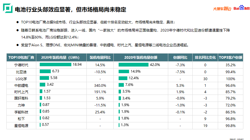 電池行業(yè)頭部效應(yīng)顯著,但隨著日韓系電池廠商站穩(wěn)腳跟,國內(nèi)“一家獨(dú)大”的市場格局將正面臨重構(gòu),2020年寧德時代和比亞迪份額遭遇重挫下降,LG化學(xué)份額提升,并且二線電池企業(yè)迅速崛起。主機(jī)廠為了降低企業(yè)經(jīng)營成本和風(fēng)險,一方面新增外部電池配套廠商,另一方面自建或合資電池廠,布局電池業(yè)務(wù),保障核心技術(shù)自主可控。