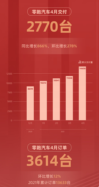 汽車信息網(wǎng)5月6日訊 零跑公布4月數(shù)據(jù):4月交付新車2770臺,同比增長866%,環(huán)比增長278%;截止到4月底,累計交付新車14608臺。4月訂單3614臺,環(huán)比增長12%,年度累計訂單13633臺,保持穩(wěn)中有升態(tài)勢,用戶認(rèn)可度越來越高,展現(xiàn)了出色的市場競爭實力。