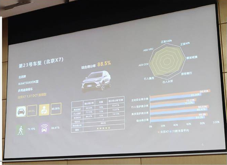 以今年3款相繼揭曉測評結果的車型為例。其中,BEIJING汽車BEIJING-X7, 測試車型為1.5T DCT致領型,綜合得分率為88.5%,具體來看,主動安全得分率為94.41%,行人保護得分率為73.15%,乘員保護得分率為90.59%,獲得了5星評價。