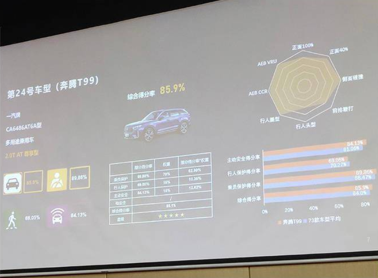 一汽奔騰T99,測試車型為2.0T自動尊享型,綜合得分率為85.9%,其中主動安全得分率為84.13%,行人保護得分率為69.05%,乘員保護得分率為89.86%,獲得了5星評價。