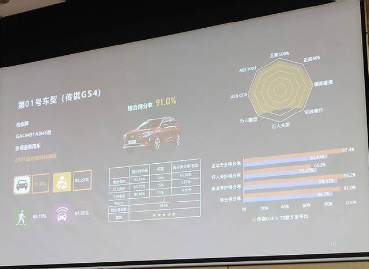 廣汽傳祺GS4,測試車型為270T自動智聯(lián)科技版,綜合得分率為91%,其中主動安全得分率為97.4%,行人保護得分率為65.2%,乘員保護得分率為95.2%,獲得了5星評價。