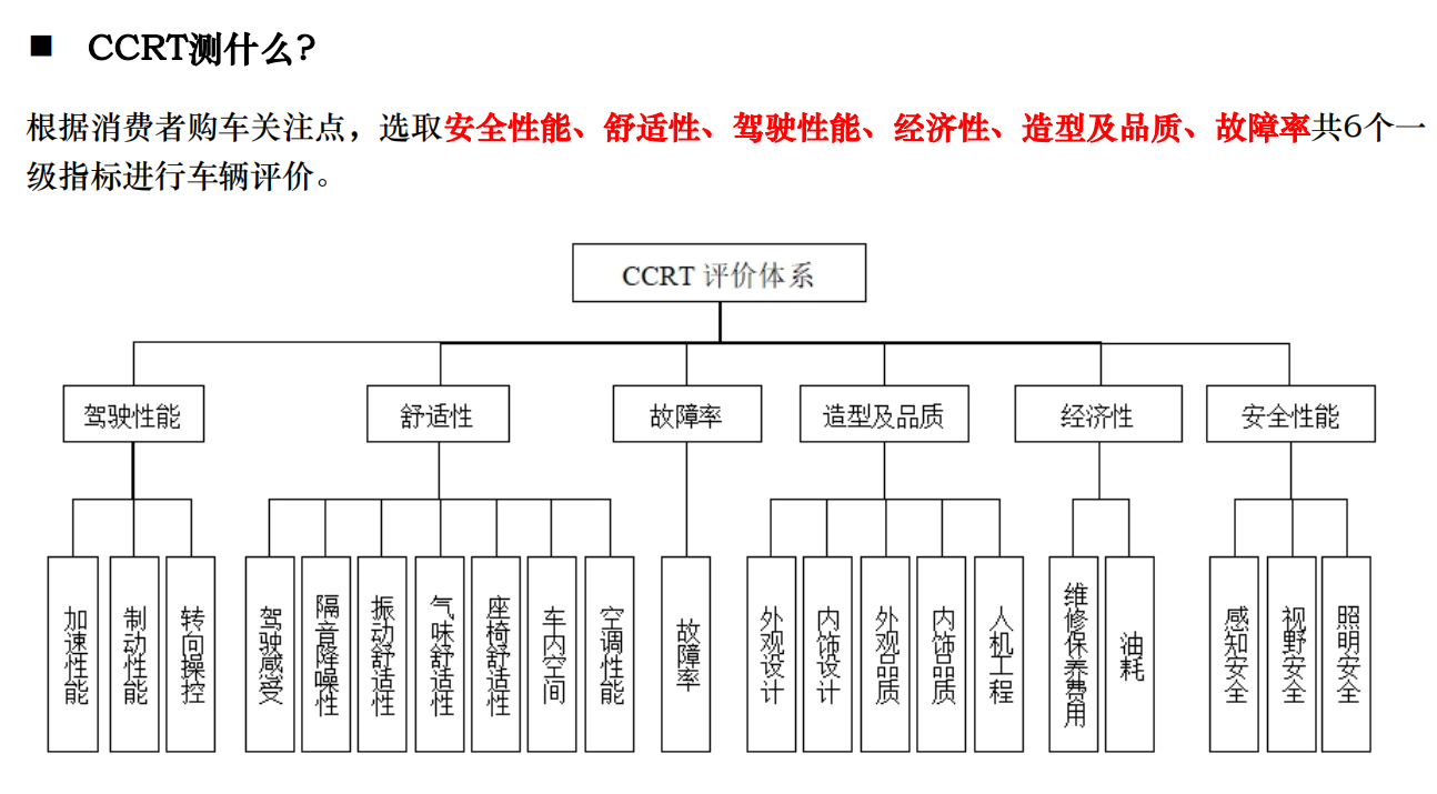 具體到相關指標上,CCRT評價體系分為四個層級,包括駕駛性能、舒適性等六個二級指標,加速性能、隔音降噪性等21個三級指標以及起步加速性能、轉向操控精準等72個四級指標,從用戶和試驗兩個維度進行綜合評價。