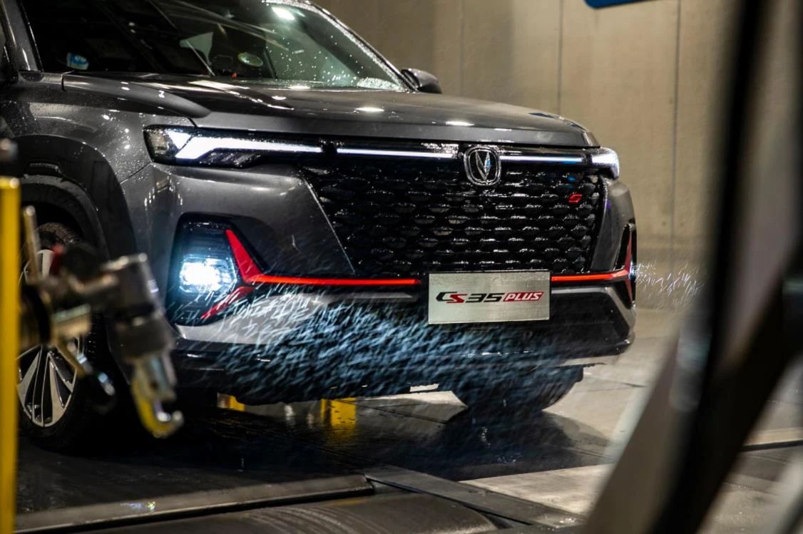 在這項(xiàng)試驗(yàn)中,全新CS35PLUS仍保持著穩(wěn)定的發(fā)揮。車輛在暴雨環(huán)境中模擬高速行駛狀態(tài),包括天窗、A柱、B柱、C柱在內(nèi)的車身各個(gè)接縫密封性都經(jīng)受了極端考驗(yàn)。在使用熒光劑的測(cè)驗(yàn)中,水流導(dǎo)流效果出色,并未阻礙駕駛員、乘客的視野,也從側(cè)面體現(xiàn)出了全新CS35PLUS的車身設(shè)計(jì)功底。