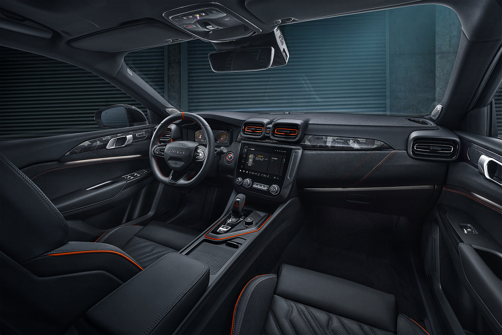 在內(nèi)飾方面,領(lǐng)克02 Hatchback座艙內(nèi)多處采用非對稱設(shè)計:以駕駛者為中心延展,門飾板、中控臺采用了非對稱設(shè)計;車內(nèi)也以橙色為主打色:橙色運動安全帶、三色縫線運動方向盤、回正環(huán)、換擋撥片及出風(fēng)口。此外,領(lǐng)克02 Hatchback座椅采用了賽車式人體工程學(xué)設(shè)計;換擋桿采用Alcantara高級翻毛皮材質(zhì)包覆。