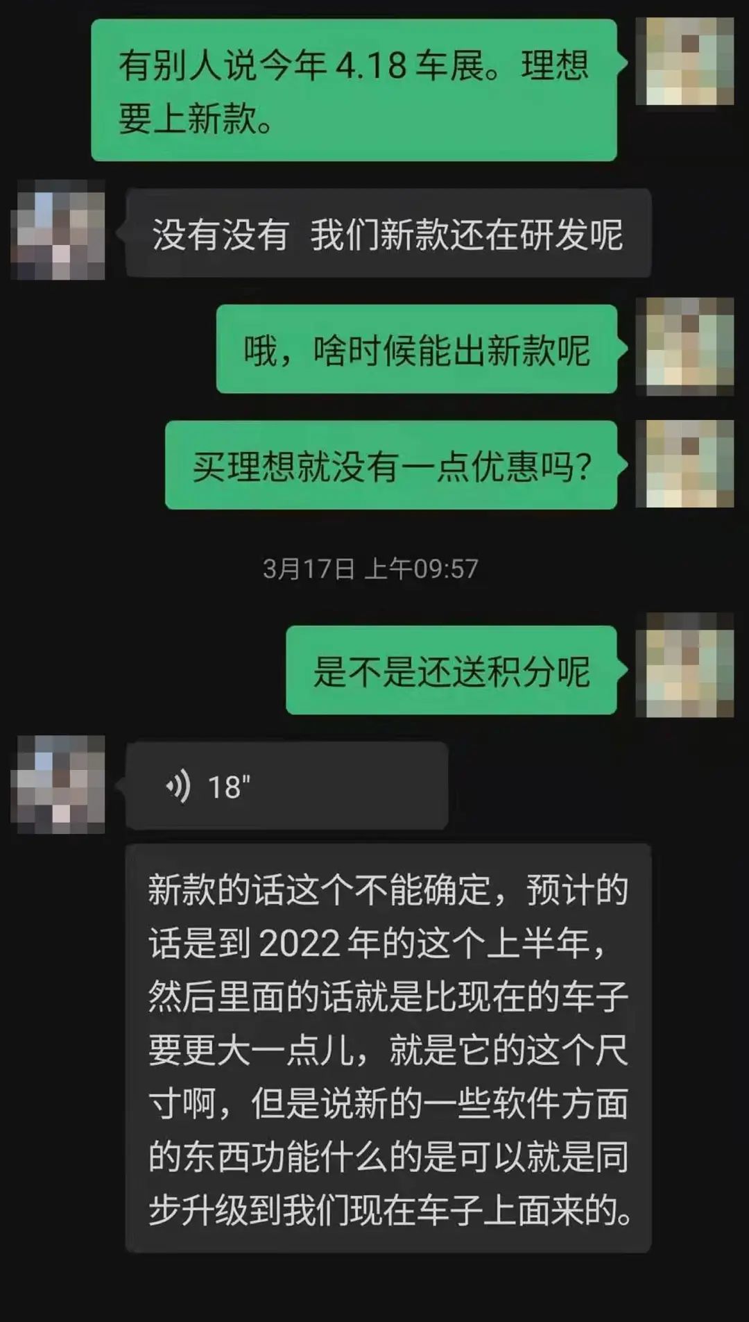在“汽扯扒談”聯(lián)系了多位新晉理想ONE車主后,一致表示被“割了韭菜”,他們大概分為兩撥:一類是在購車前已經(jīng)跟銷售確認(rèn)過近期是否會(huì)改款,但得到的回復(fù)均是不會(huì),理想ONE銷售甚至打包票告訴他們“放心買,改款了就找我”,個(gè)別消費(fèi)者還享受到了8000元的現(xiàn)金優(yōu)惠。